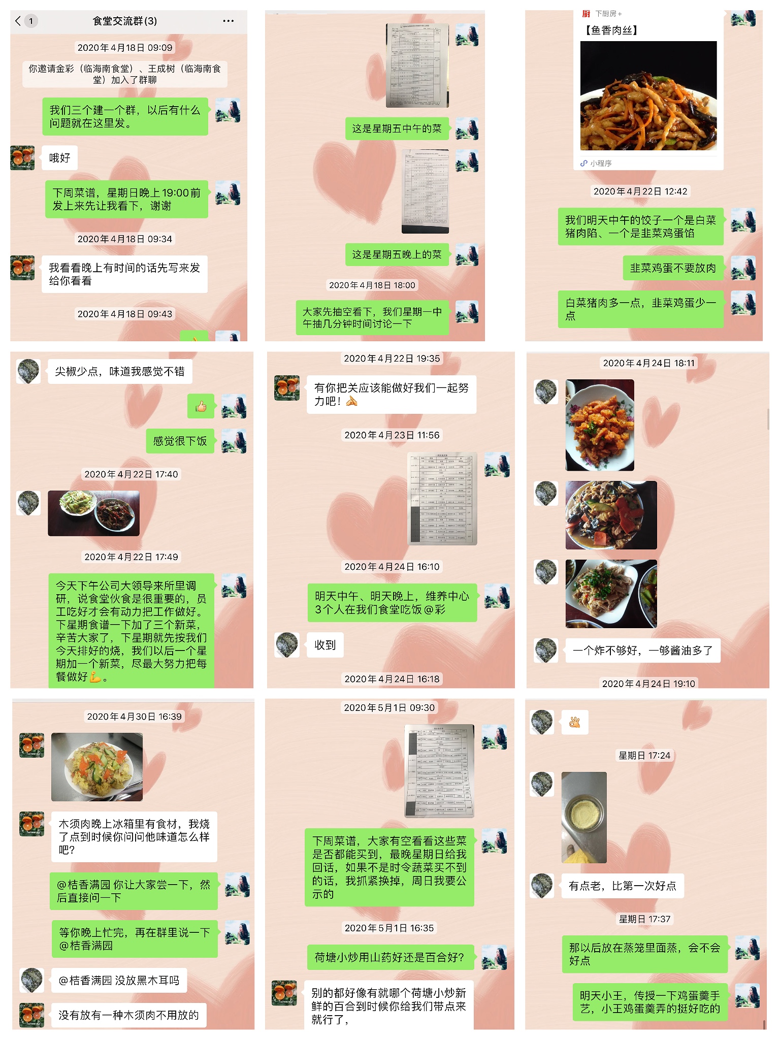 今年4月中旬,所務(wù)陳瑩利用微信建立了食堂交流群,經(jīng)常在群里上傳從網(wǎng)上、廚房APP上下載的一些簡單又美味的家常菜制作方法。并結(jié)合食堂人員的特長,針對(duì)季節(jié)變換,合理調(diào)整飲食,做到葷素搭配、飯菜每班一日三餐不重樣等要求,提前列出每周菜譜,要求食堂人員根據(jù)菜譜,每周針對(duì)創(chuàng)新家常菜,提前準(zhǔn)備少量食材,精心燒制,待嘗試滿意后再供應(yīng)。