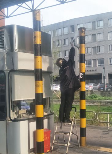 圖為工作人員用殺蟲劑噴射蜜蜂 當班副班長何丹燕立即將車道內(nèi)情況報告給所領導,副所長何先林聽聞后急急披上雨衣,戴上頭盔和手套,迅速趕到車道,經(jīng)過簡單防護的他用殺蟲劑噴射蜜蜂集聚的位置。與此同時,何丹燕疏導后方車輛從其他車道通行。