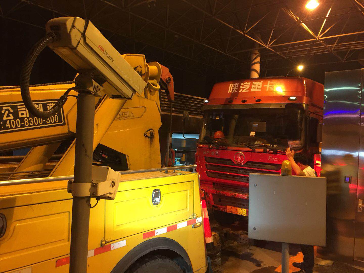 圖為載滿貨物的超載車 拖車很快到達車道,經初步檢查后確認是傳動軸故障,液壓油漏了一地。十分鐘后,車子被拖離了車道。由于車子漏的液壓油較多,為避免后來車輛在車道內打滑,收費員胡德金和施救人員嘗試用水沖,但發現效果不好,又用洗衣粉沖了一遍確認不會滑后再開通車道。沖洗好車道后兩人手上的機油味久久不能去除。