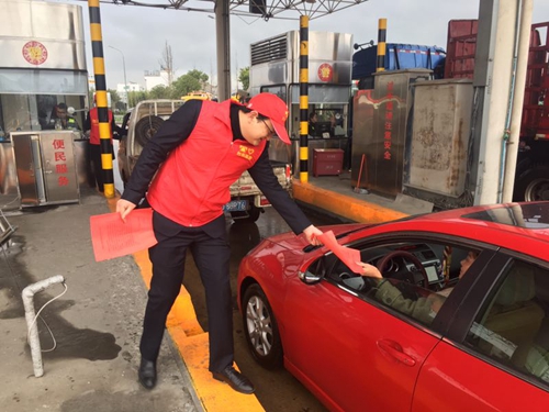 圖為員工在車道向過往司乘發放《清明文明祭掃和森林防火倡議書》