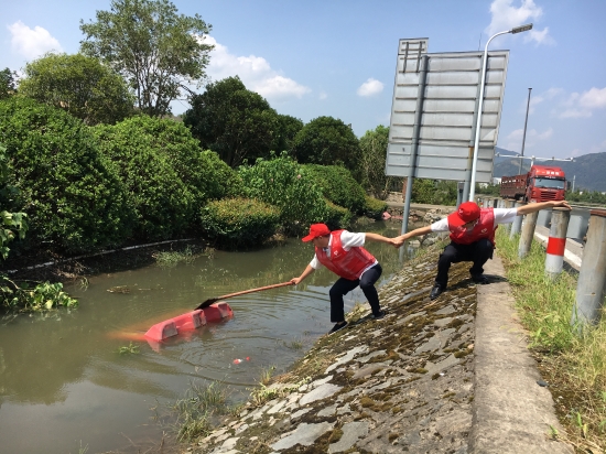 圖為志愿服務(wù)現(xiàn)場 隔離護欄被風(fēng)吹歪的,將其扶正,并作簡單的固定;綠化帶好多樹被連根拔起,找來撐桿、繩子進(jìn)行加固;斷枝殘葉滿地都是,就用手撿,用掃把掃,集中堆放倒伏的斷枝;清掃路上的垃圾;清除路障;打撈被風(fēng)吹入邊溝的水馬;對收費區(qū)域的衛(wèi)生來了一次大清理…… 臺風(fēng)后氣溫升高,空氣濕度大,天氣異常悶熱,志愿者們揮汗如雨,一個個臉被曬得通紅,他們卻沒有因此放下手中的工具,停滯清理的步伐,迎“熱”而上,為災(zāi)后的恢復(fù)貢獻(xiàn)自己的力量,用行動踐行初心和使命。 夏蓮萍