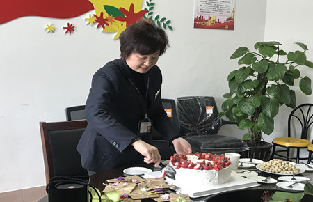 圖為陶秀英同志在歡送會現場切蛋糕 歡送會上,章海峰代表臺州高速,對陶秀英同志二十余年如一日為集團發展所付出的辛勞和貢獻表示了衷心感謝,預祝她退休生活豐富多彩,也希望她退而不休,常回“家”看看。同時號召年輕員工學習陶秀英身上傳承勤勤懇懇、認真踏實的態度與精神,為征費管理共努力,為集團發展共拼搏。