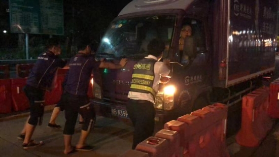 圖為收費(fèi)員幫助司機(jī)將故障車(chē)輛推出車(chē)道 8月15日凌晨1點(diǎn)多,溫嶺西收費(fèi)所征費(fèi)二班安全員在日常巡邏時(shí)發(fā)現(xiàn)一輛小型貨車(chē)停在進(jìn)口內(nèi)廣場(chǎng),在詢(xún)問(wèn)司機(jī)后得知車(chē)輛因出現(xiàn)故障導(dǎo)致無(wú)法發(fā)動(dòng)。安全員當(dāng)即叫來(lái)旁站人員,與兩個(gè)司乘人員一起用力,慢慢地將該車(chē)推出車(chē)道。在婉拒了司機(jī)遞香煙的好意后,安全員囑咐司機(jī)盡快聯(lián)系人員前來(lái)解決,后回到崗位繼續(xù)工作。