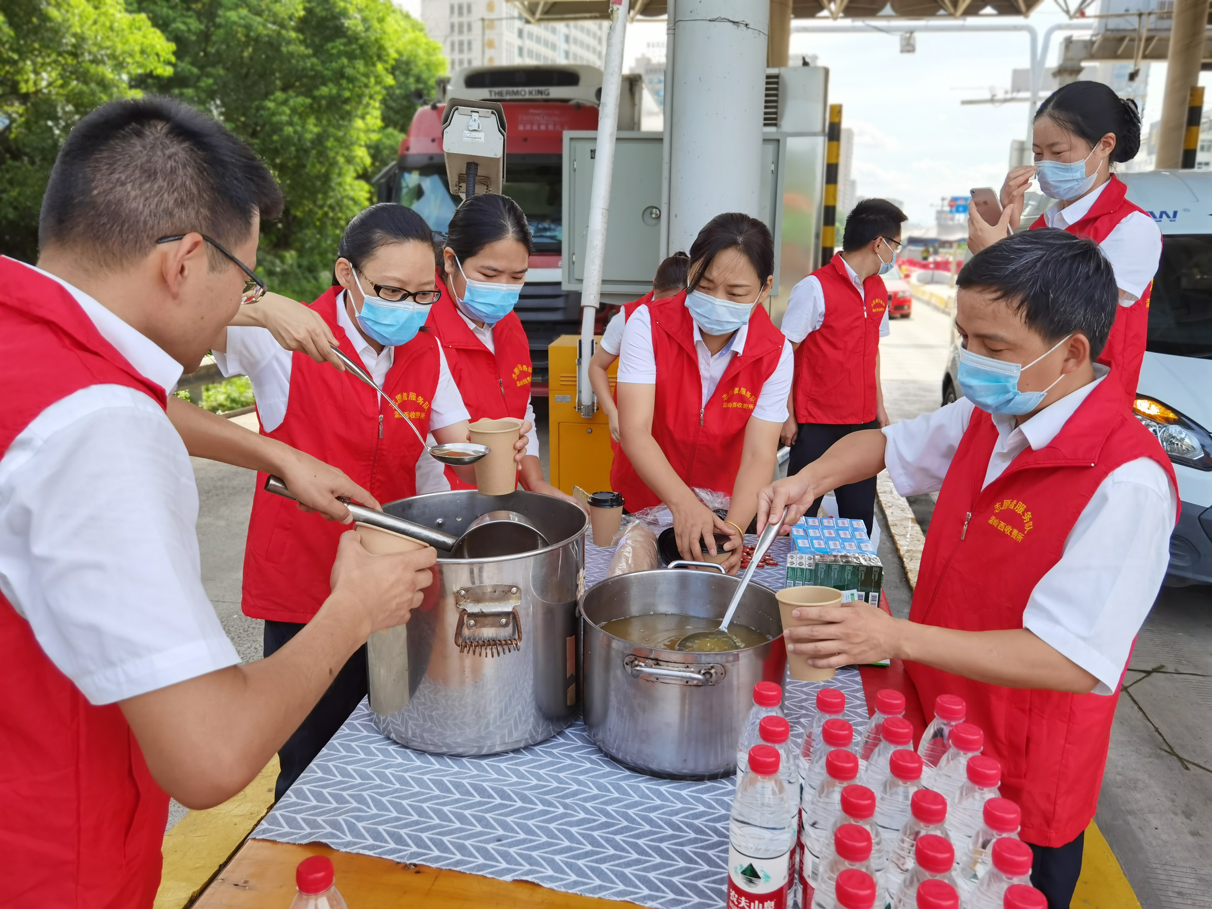 在溫嶺西收費所進出口處,志愿者們身穿紅馬甲,面帶微笑地向途經的司乘們遞上一杯杯蓮子湯、紅棗綠豆湯,并溫馨提醒司乘注意疲勞駕駛。 近日,連續高溫,驕陽似火,為進一步延伸文明服務,緩解司乘人員暑熱疲勞,臺州高速溫嶺西收費所組織志愿者積極開展“炎炎夏日送清涼”活動,為行駛在路上的廣大司乘送上一份夏日的清涼。