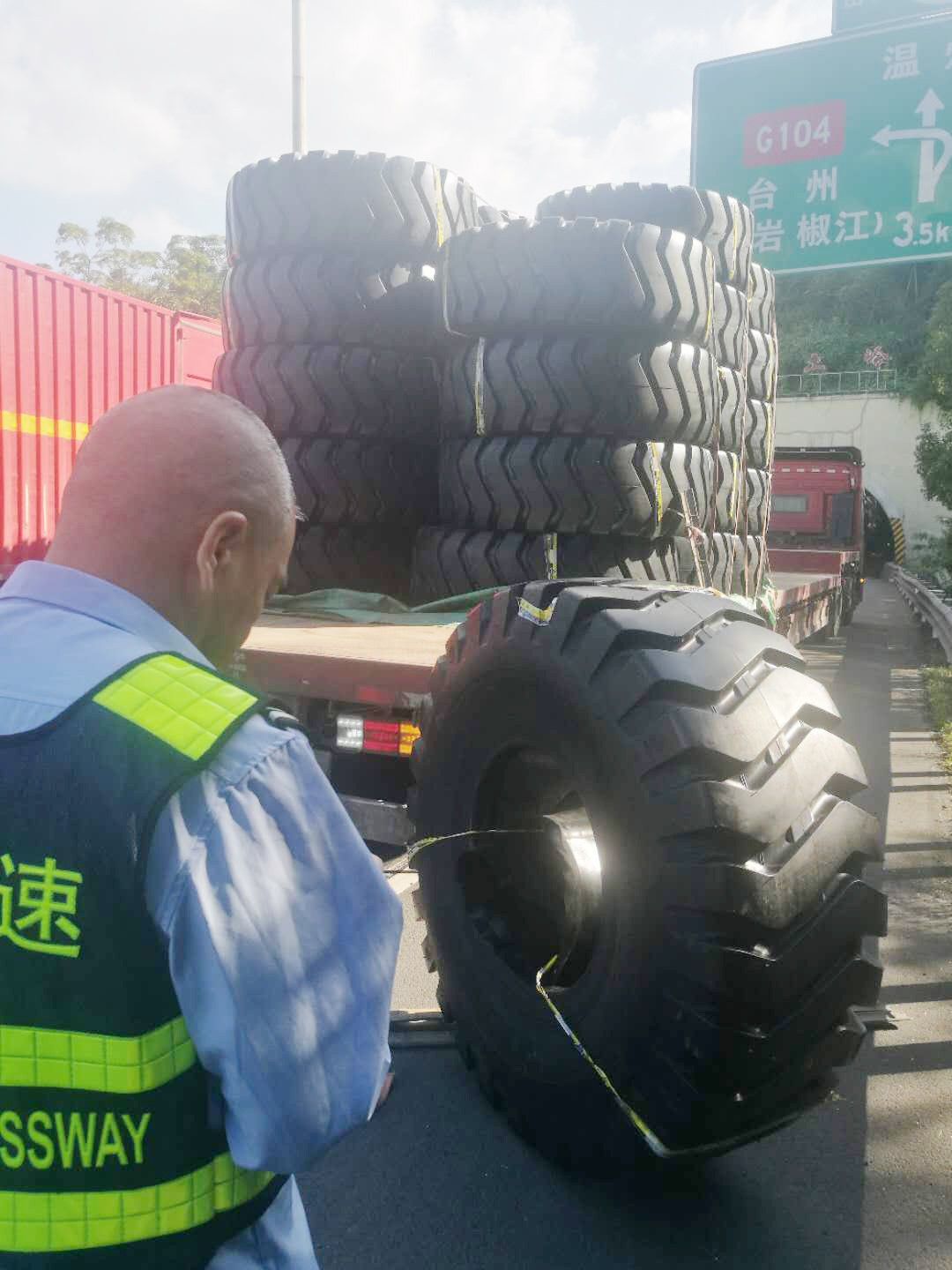 執勤隊接警后立即趕往事故地點,一輛運載輪胎的貨車停靠在主車道,其中一個巨型輪胎滑落到硬路肩上,致使后方車輛紛紛避讓。為及時消除險情,執勤隊快速在現場做好安全警戒工作,同時將現場情況反饋給監控中心。由于貨車綁繩索松動,重達300多斤的輪胎脫落在地,隨后執勤隊協同施救中心、駕駛人員合力將掉落的輪胎先拖至車旁,經過長達半個小時的搶險,跌落的貨物終于完好無缺地回到貨車上,道路恢復暢通。 筆者溫馨提醒:在高速公路行駛過程中,駕駛人應注意將車上的貨物固定好,途中要隨時注意貨物及捆綁繩索是否松動。無論是車輛撒落物還是人為拋灑物,都會給道路安全暢通埋下了重大隱患! 林玲
