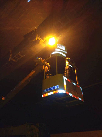 1月31日上午,該所執(zhí)勤隊員在隧道巡邏時發(fā)現(xiàn)溫向快車道一盞照明燈被超高車刮蹭而導(dǎo)致燈罩損壞,燈頭及組件掛落蕩在橋架下,很容易造成二次事故而引起人員傷亡。一發(fā)現(xiàn)該隱患,隊長李新波立即向所長李立巍報告險情,馬上聯(lián)系高速交警、指揮中心人員,要求立即封道搶修。 大溪嶺隧道所在險情發(fā)生的第一時間作出緊急措施,兩名執(zhí)勤隊員在溫向隧道洞口卡口預(yù)警,李立巍向維養(yǎng)中心調(diào)來登高車,三名電工隨即進隧道維修脫落的燈罩。經(jīng)過25分鐘的快速搶修,目前設(shè)備已能正常使用,隧道恢復(fù)通行。 李新波