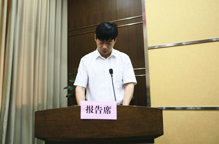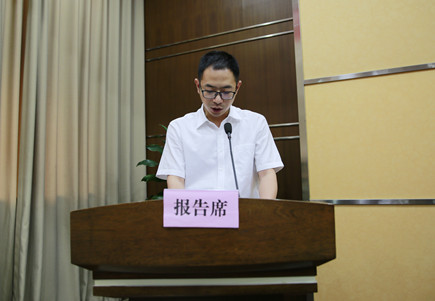 圖為公司工會主席項義超宣讀議案,作為總監票人宣讀投票表決結果