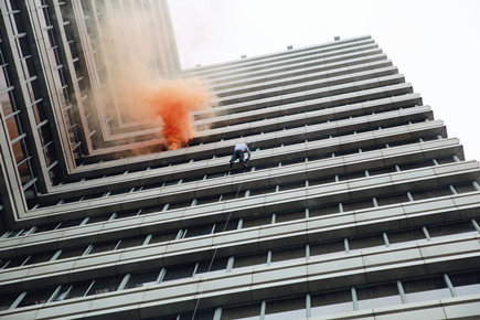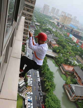 上圖為高空墜落逃生演練現(xiàn)場