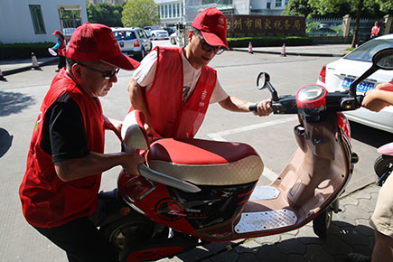 上圖為志愿者服務(wù)隊(duì)合力推離停放不規(guī)范的電瓶車、三輪車