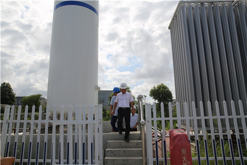 在加氣工藝區(qū),張建平一行帶上頭盔,深入到加氣站的核心區(qū)塊了解加氣站的運行狀況,看到嶄新的設備和整潔的環(huán)境,張建平頻頻點頭。