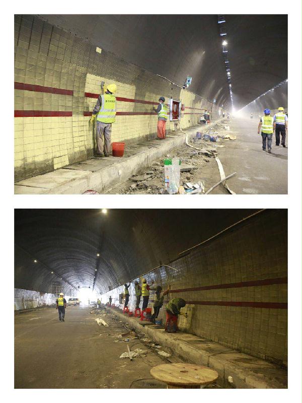 大溪嶺隧道機(jī)電整治施工現(xiàn)場,隧道壁正在做墻面處理,隧道內(nèi)高溫且揚(yáng)塵惡臭。