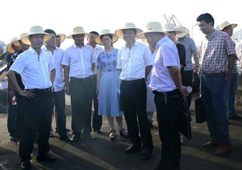 圖為臺州市副市長張加波實地察看海門港埠碼頭與新港區規劃建設用地 烈日下,調研組分別實地察看了海門港埠碼頭與新港區規劃建設用地。結合海門港埠總公司現狀用地區域圖及新碼頭選址方案圖展板,羅小將詳細介紹了港區碼頭目前區域現狀及新港區選址規劃設想方案,提出了港區剩余土地利用、建設項目規劃許可、新港區建設用地征遷安置等需要政府相關部門和椒江區政府大力支持的問題。