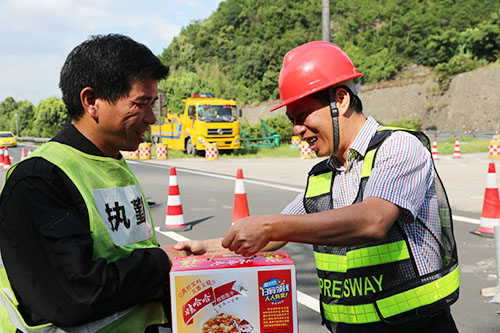 圖為集團(tuán)總工程師江輝為交通疏導(dǎo)員送上慰問品 大溪嶺隧道溫向隧洞中,施工人員正在拆除原設(shè)備,除了噪音和洞中彌漫的灰塵,高溫高濕的環(huán)境也嚴(yán)重考驗(yàn)著施工人員的身心。江輝提著慰問品,向隧洞中和烈日下正在崗位上工作的施工人員和交通疏導(dǎo)員送上慰問品。考慮到一線人員的特殊情況,江輝特別要求采購人員將送清涼物資改為八寶粥、蛋黃派、飲料等可以直接食用的物資,方便施工人員可以隨時(shí)補(bǔ)充能量。