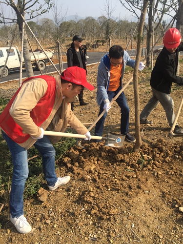 圖為植樹現(xiàn)場 由于此次栽種的樹苗偏大,大家分組合栽樹苗,腳踏泥濘,挖坑、下樹苗、填土、澆水……栽種現(xiàn)場氣氛熱鬧,雖然一身泥巴,大家卻樂此不疲。在近一個小時的共同努力下,分配的樹苗栽植完成,大家還為自己植的樹掛上“樹木領(lǐng)養(yǎng)卡”,在栽種好的樹苗前合影留念,為自己種的樹賦予更多的意義。