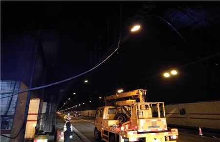 “南廣場有大貨車報警,據說發生事故……”4月17日凌晨3時55分,大溪嶺隧道中控室接到了臺州監控中心緊急來電,執勤隊立即驅車趕赴現場查勘。 巡邏車到達南廣場后,執勤隊員發現溫向隧道進洞1公里處,隧道頂部的攝像頭被撞損,造成電纜橋架移位,電纜下垂橫跨車道,存在嚴重安全隱患。事發突然,執勤隊員立刻做好安全預警措施,同時聯絡集團工程養護部機電維養中心,請求支援開展緊急搶修。