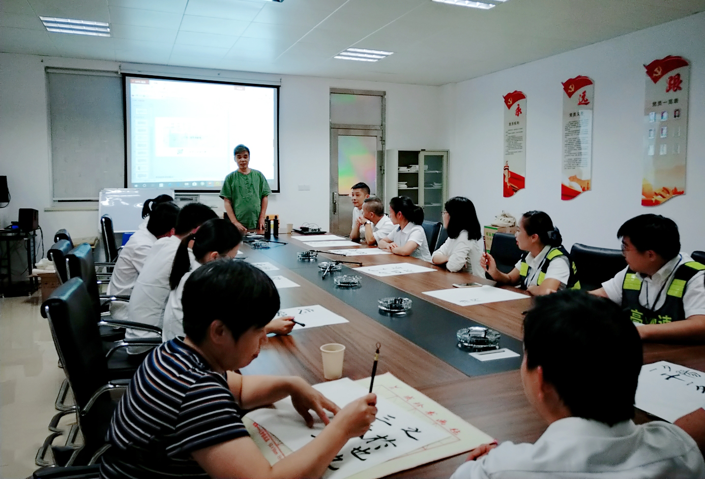 圖為培訓現(xiàn)場 本次培訓內容主要針對書法作品注意要點展開。課堂上,陳士春以風趣灑脫、通俗易懂的授課方式,對書法作品注意要點進行深入講解,并在白板上、紙上進行書寫演示,詳細地講解漢字的起筆與收筆,筆畫之間的搭配,同時手把手指導學員們書寫的技巧和注意事項,與大家互動交流,為大家在學習書法過程中遇到的困難答疑解惑。陳士春鼓勵大家堅持每天練習,書法一定要持之以恒,