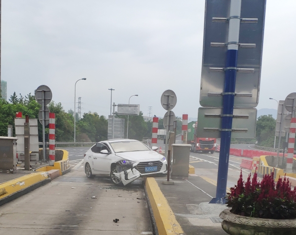 9月8日上午7點(diǎn)30分,一輛白色現(xiàn)代轎車在臺州收費(fèi)所出口準(zhǔn)備進(jìn)入ETC車道時,突然撞向車道右側(cè)的全安島,在與安全島發(fā)生碰撞后,又一頭撞向了左側(cè)的安全島
