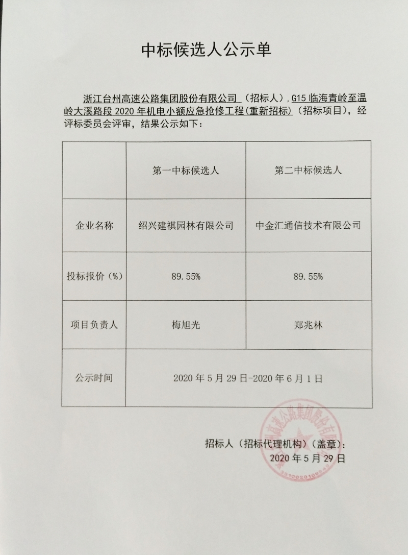 G15臨海青嶺至溫嶺大溪路段2020年機(jī)電小額應(yīng)急搶修工程(重新招標(biāo))中標(biāo)候選人公示單