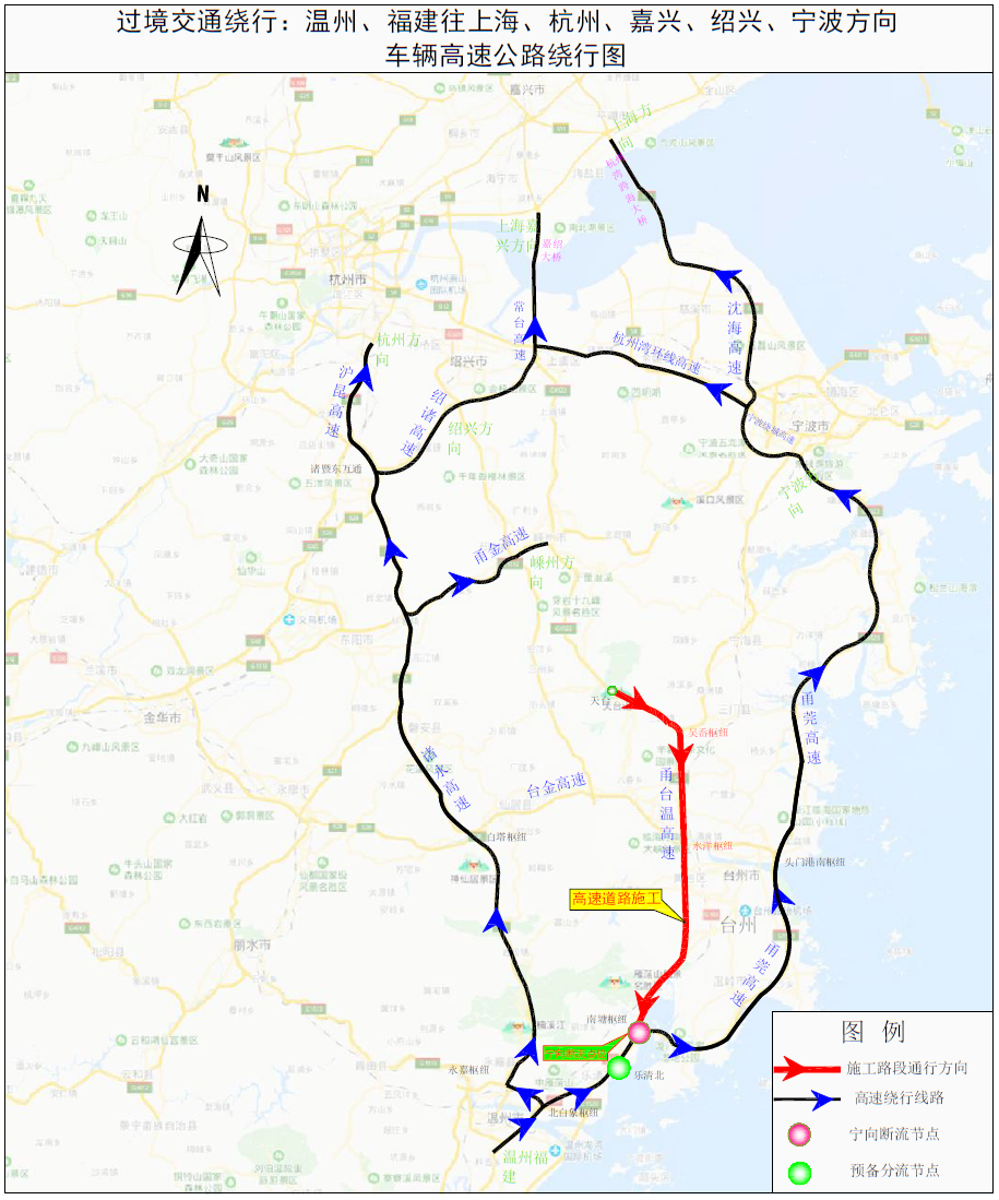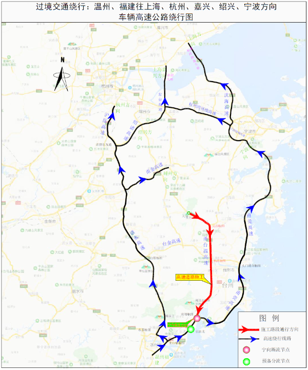 在甬臺(tái)溫高速寧波方向南塘樞紐進(jìn)行斷流,所有車(chē)輛改走甬莞高速;甬莞高速南塘樞紐轉(zhuǎn)甬臺(tái)溫高速寧波方向匝道關(guān)閉;臺(tái)金高速水洋樞紐轉(zhuǎn)甬臺(tái)溫高速寧波方向匝道關(guān)閉;甬臺(tái)溫高速溫州方向吳岙樞紐轉(zhuǎn)上三高速上虞方向匝道關(guān)閉;甬臺(tái)溫高速溫州方向、上三高速三門(mén)方向保持通行,部分路段借用對(duì)向車(chē)道通行。