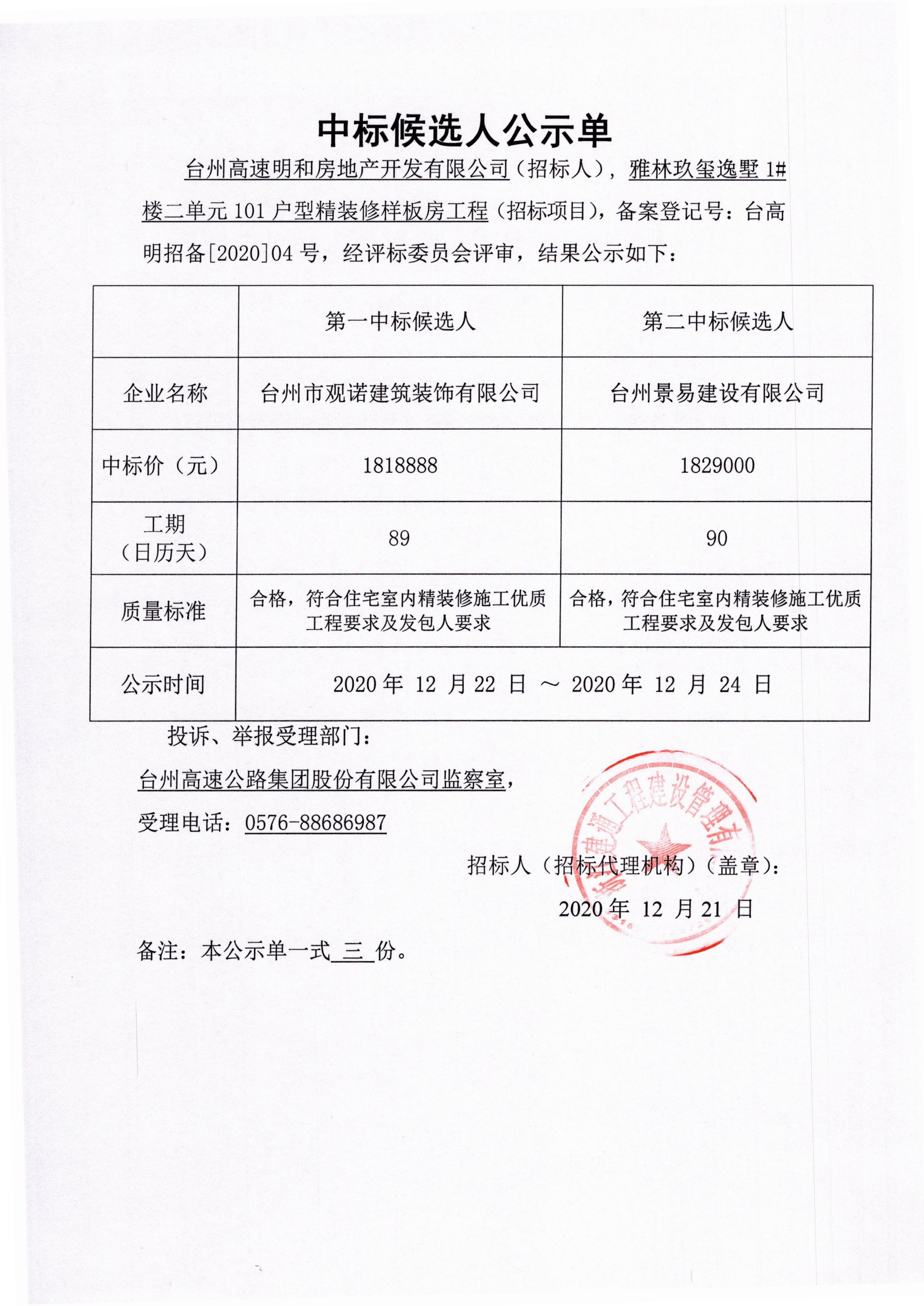 雅林玖璽逸墅1#樓二單元101戶型精裝修樣板房工程中標候選人公示單
