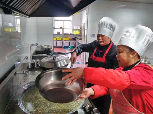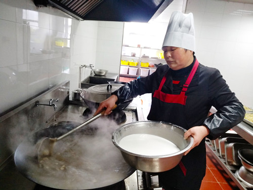 浸了一夜的早米,用石磨磨成米漿,細(xì)膩而幼滑,被靜置在盆里。“一般都用米粉泡水,口感粗糙,而且吃起來(lái)沒有香頭。”利花一邊說(shuō),一邊將香腸切碎與豆腐、冬筍、胡蘿卜、芹菜、香菇、蠶豆瓣翻炒著。旁邊的大鍋里,長(zhǎng)長(zhǎng)的豆面在骨頭湯里翻滾著,像一棵棵舞蹈的海草。徐徐倒入的米漿,被不停地?cái)嚢瑁耙钦车藉仯蜁?huì)有焦糊味,這鍋羹就算廢了。”米漿好像不夠,利花有些懊惱,“要是在家里,米漿都會(huì)多準(zhǔn)備一些,不夠就隨手添,我?guī)У竭@里就這些,也沒得加了。”就叫在一邊做幫手的妹妹寶花用面粉和山粉(也就是番薯粉)摻水拌起來(lái),倒入鍋里,湯漸漸濃稠起來(lái),倒入之前炒好的配料,加上切得細(xì)細(xì)的綠綠的芥菜梗、芥菜葉、海蠣,鍋里不時(shí)冒起大泡,香氣四溢。 為照顧吃不慣糟羹的同事,食堂還準(zhǔn)備了一鍋甜的山粉糊。來(lái)自臺(tái)州各縣市區(qū)的同事,按各自飲食習(xí)慣選擇了咸的或甜的。有說(shuō)芹菜的味道蓋過(guò)了芥菜清香的,有說(shuō)沒有加入芋頭口感不夠糊的,但撲鼻的香氣和濃厚豐富的口感立刻讓人忘了挑剔。對(duì)我來(lái)說(shuō),碧綠的芥菜葉和白胖的海蠣肉是整碗羹的顏值擔(dān)當(dāng)和靈魂所在。 每個(gè)元宵節(jié),對(duì)于在崗的同事們是沒有花燈可看、沒有燈謎可猜的,也不能與家人聚在一起吃羹。車道上此刻正是流量高峰期,大家匆匆吃完,都要趕著上崗。食堂大姐把多出的糟羹和山粉糊放進(jìn)蒸飯鍋保溫,叮囑大家下班后再來(lái)吃點(diǎn),這個(gè)吃了不扛餓。此時(shí),除了食物最能體現(xiàn)節(jié)日氣氛外,還有那一份特意為你留著的溫?zé)岣屓烁袆?dòng)。 鄭瑛芝