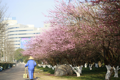 最后一站,便是市民廣場,我見過的最美公交站臺。初春的清晨啊,一下車便有沁香拂散,迎接我下車的那是大片繁花盛開呀,路邊草地一溜的紅梅、白梅,在藍天下絢爛地肆無忌憚地綻放。呵,是的,還有藍天,最近流行的一個詞叫“臺州藍”,忽然想起來,每日公交車上下班,低碳出行,這算是我為“臺州藍”添了一筆淡藍嗎?應該是吧。于是,在藍天紅白花海中,慢慢穿過梅林、小橋、亭子,上班之路竟是如此心情舒緩。 鄭蔚