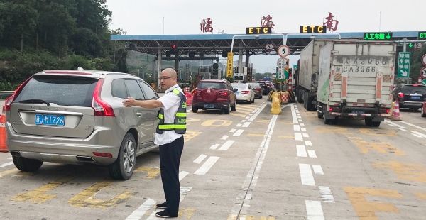 節(jié)日期間,車流量比往日多很多,每天多次出現(xiàn)長時(shí)間大分流,一遇上高峰期車輛源源不斷地從各個(gè)方向匯聚在此,容易造成內(nèi)外廣場堵車。臨海南收費(fèi)所車輛雖多,但該站所出口秩序井然,未出現(xiàn)擁堵現(xiàn)象。瞧!這位在車流中,身著反光背心在這場大車流中,揮舞著雙臂指揮著交通,讓飛馳的車輛通過客貨分離,有效降低客貨車隨意串道,達(dá)到快速放行的是四班班長楊俊輝。