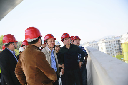 圖為公司總經(jīng)理張建平在8#立交橋上了解相關(guān)工程情況 張建平一行首先實地查看了內(nèi)環(huán)北路(江口段)項目工地,聽取工程進展情況匯報。在現(xiàn)場,只見爆破量達到70%的安然山體已經(jīng)開辟出一條可供工程車輛通行的大口子,耳邊不停地傳來機器忙碌作業(yè)的轟鳴聲。張建平一路由東向西穿行在施工便道上,看到施工區(qū)域一側(cè)各種安全防范設(shè)施有序排列,感受到沿途濃烈的施工氛圍,他對此表示滿意。 途徑內(nèi)環(huán)路8#立交項目工地時,張建平沿著臨時搭設(shè)的通道,爬上8#立交橋,遠眺8#立交放射線項目所在地,向有關(guān)人員了解該項目前期準(zhǔn)備工作情況。眼下,距離11月11日內(nèi)環(huán)路主線通車僅剩下近半年的時間,張建平強調(diào),各部門要努力抓好施工進度,保證工程質(zhì)量,更要時刻將安全放在首位。 陳林偉